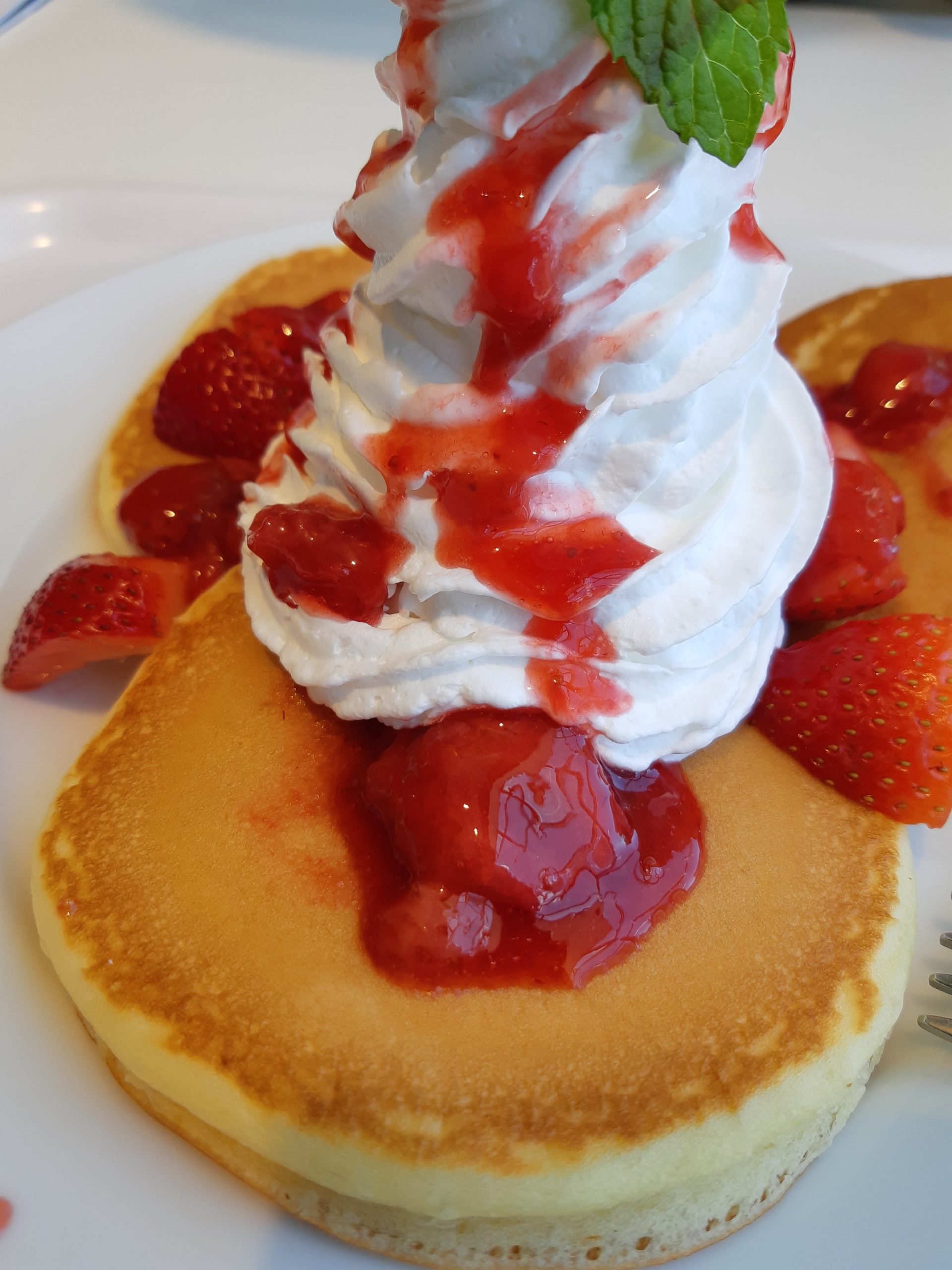 しかし、イチゴジャムとクリームが乗ったパンケーキを注文している人が多くそれを見ていたら自分も食べたくなってしまい、ついに食べることになりました!